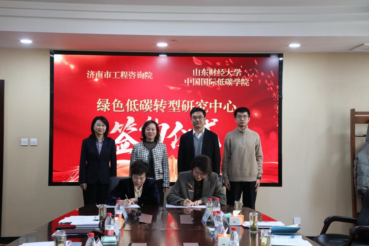 會上,雙方圍繞 “綠色低碳轉(zhuǎn)型研究中心”未來的目標(biāo)定位、業(yè)務(wù)方向和運行模式等內(nèi)容進(jìn)行交流探討。隨后,濟(jì)南市工程咨詢院副院長兼總會計師黃健與山東財經(jīng)大學(xué)中國國際低碳學(xué)院執(zhí)行院長王璟珉共同簽署“綠色低碳轉(zhuǎn)型研究中心”合作協(xié)議。