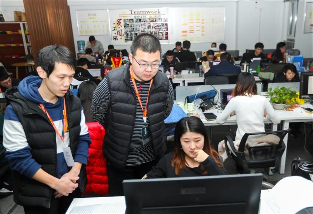 在4樓眾創(chuàng)空間,聚集著50多家在孵跨境電商企業(yè),多數(shù)都是90后創(chuàng)業(yè)人員。25日臨近傍晚6點,不少創(chuàng)客仍埋頭忙碌。在眾創(chuàng)空間打造的咖啡吧,幾個年輕人正探討業(yè)務(wù)。